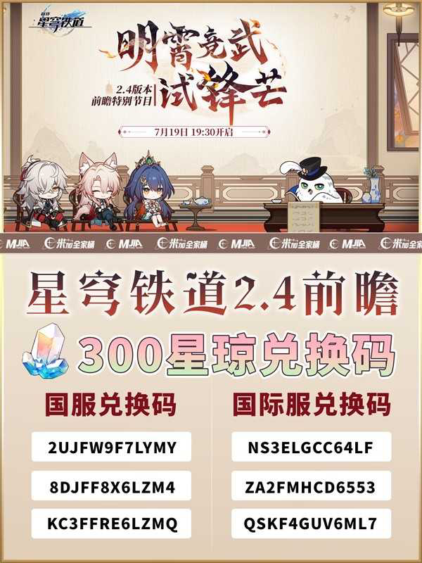 《崩坏星穹铁道》2.4版本前瞻节目放出了300星琼的兑换码,包含国服和国际服的。下面为大家带来《崩坏星穹铁道》2.4版本前瞻节目兑换码分享,希望对大家有用。