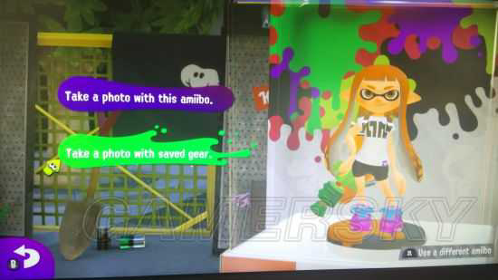 之后再去这里刷amiibo就只有拍照的选项了,选第一个是和amiibo原来的形象合照,第二个是amiibo穿着你自己保存的装备合照,乌贼因为不能穿人型装备所以就没有第二选项了。我是不用退出直接刷下一个。