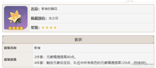 谈四星圣遗物,绝对绕不过教官四件套。教官四件套可以在触发元素反应后提升队伍所有成员120元素精通,这对于以反应为核心的队伍弥足珍贵。教官套最常见的场合就是在胡桃队和融化甘雨队中。
