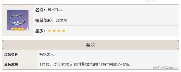 这些圣遗物的作用是减少对应元素的附着时间。这些效果目前是没有五星圣遗物替代的。在大部分情况下,这些圣遗物的作用不大,但是仍然建议大家各留一件,以备不时之需。比如,假设以后某期深渊有迟滞之水环境,且其中有两个水深渊使徒,那么如果需要用胡桃行秋钟离+重云的队伍来破盾,此时重云带祭水礼冠就会是应对迟滞之水的最好解法。