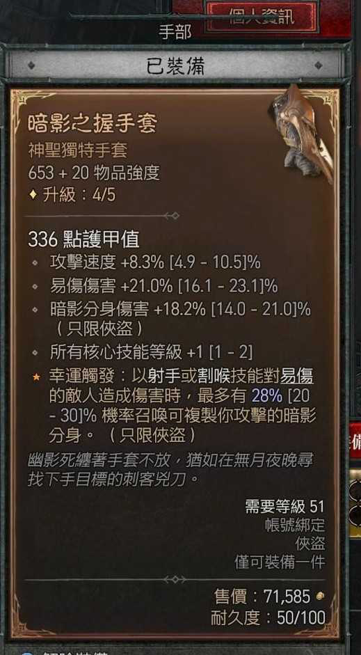 装备部分没啥太多要求,可以尝试暗影之握手套,除了自己的分身之外还可以再叫个好兄弟出来,搭配重新振作的耗能加幸运,触发率不差。