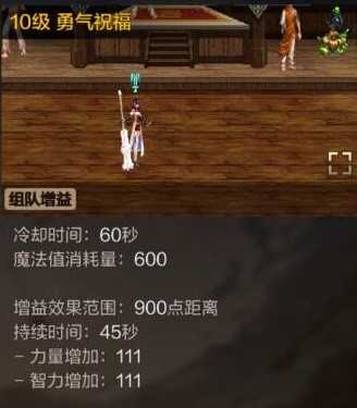 核心核心buff技能【勇气祝福】可提高全体队员的力量、智力和命中率,配合被动【守护祝福】还能额外提升队友的生命值和魔法值上限,进图后应该最优先施放。