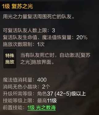 【复苏之光】可以复活死亡队友并恢复队友20%的生命值和魔法值,且不占用复活币使用上限。在一些容易团灭的副本里,可以由圣骑士一人复活来拉起其他队友,避免使用复活币。