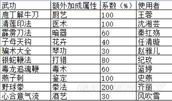 额外加成系数:额外加成的属性,系数x(等级/100)。如软功加成逍遥拳法50%,100级软功系数为0.5x(100/100)=0.5,120级软功系数为0.5x(120/100)=0.6;