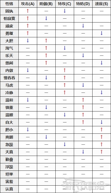 性格总共有25种,同名宝可梦也会具有不同的性格,根据所选择的性格,宝可梦的【攻击】、【速度】或其他属性数值会增加,同时会有其他属性下降。如果想要提升一个特定的数值,建议通过下方表格来选择合适的性格(提升为1.1倍,下降为0.9倍)。也有些性格是不存在补正的,同样可以参考下方表格。
