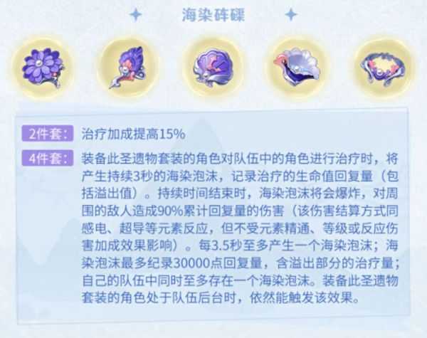 PS:假如队伍中有多名佩戴海染砗磲四件套的角色,只会产生一个海染泡沫,但佩戴四件套效果角色造成的生命值恢复量均会被记录(包括己方角色满血时溢出的治疗量)。