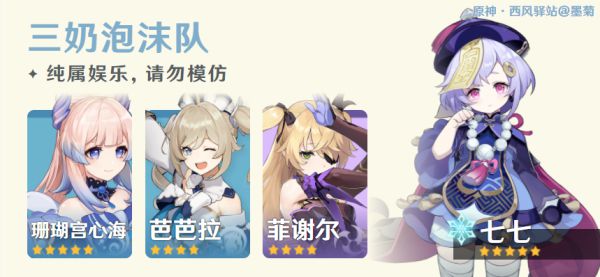 ◎元素爆发提供的度厄真符高达15秒,但七七自身没有产球能力,面对高达80点能量的元素爆发,只好去寻求队友的帮助了,为了最大化海染泡沫的伤害,可以将七七安排在冰雷超导的队伍中,如下。