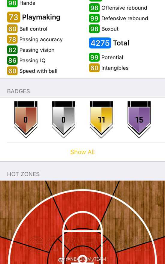 大前毕业卡:几乎没有短板,92的空位三分、90的速度,以及自不必说的防守和篮板。自带15个紫徽章:隔扣达人、篮筐保护者、持球防守精英、精英篮板手、挡拆投篮手等含紫量较高。
