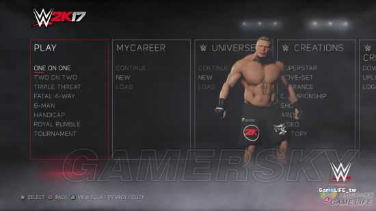 《WWE 2K17》不像大部份的 2K 游戏新作,在推出时特别强调这回着重于哪些模式,而是将前作所设计的系统再更进一步进化,修改。不论是游戏开头动画或选单画面,都感觉到传达出稳重的气息。开头动画以收录不同时代的摔角记录来表现美国摔角的历史,黑白画面的一幕确实表现出了悠久的历史。选单就像开战前的舞台,以文字、黑幕、干冰来构成,偶尔还会看到几位摔角明星走来走去,就像在为开战做准备。