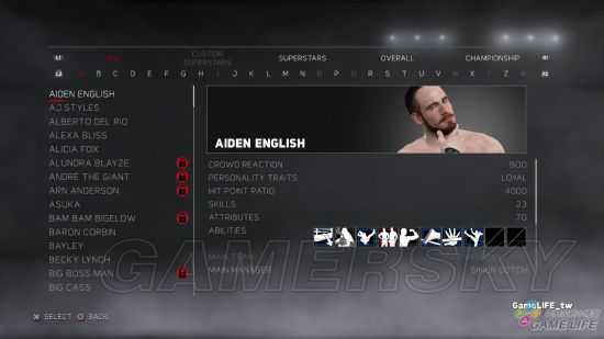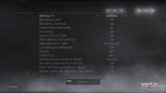 设定项目除了基本的难易度外,能修改的量也越来越多,伤害比例、流血演出、字幕有无,甚至连内建的所有摔角手能力值都可以更改。如果是新玩家的话,就先不用太在意这些部份,顶多把难易度改简单就好了。