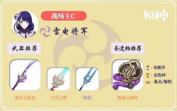 ①薙草之稻光:雷神“专属武器”,副属性增加元素充能效率,配合特效元素充能效率转攻击力并在使用元素爆发后增加充能的两项雷神核心属性,使得绝缘之旗印4件套(增强元素爆发75%伤害)效果进一步增强。