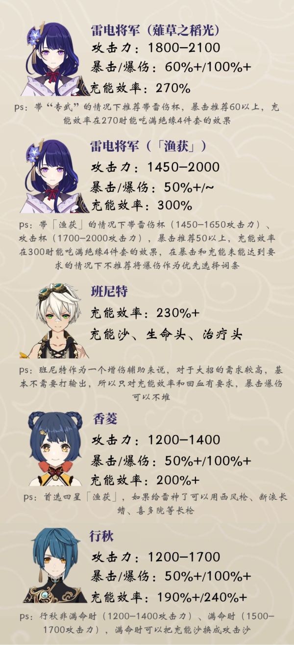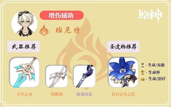 班尼特需考虑基础攻击力高的武器(班尼特基础攻击力转化为角色获得的攻击力加成)。因为队伍中有雷神的存在,充能压力较小,所以充能武器是次选