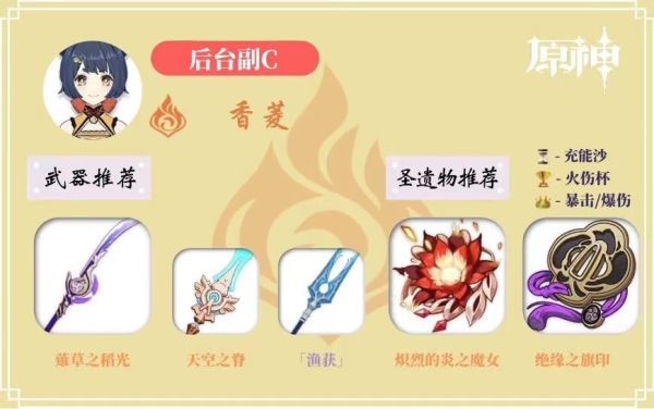 注:时之沙主词条推荐充能效率加成,空之杯推荐火伤属性,理之冠主词条可选择暴击率或者爆伤。副属性推荐充能效率>暴击>暴伤>精通