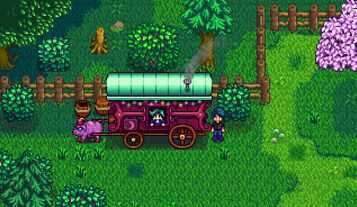 然后,重点!重点!重点!!!每周五和每周日,一定要去南部森林巫师塔上方看猪车!有几率刷出稀有献祭品啊,高级洒水器啊,你急需的送礼物品啊什么的,一定要买!所以身上最好随时留点钱。不过前期他卖的东西也不太贵。后面我会专门讲一讲猪车。