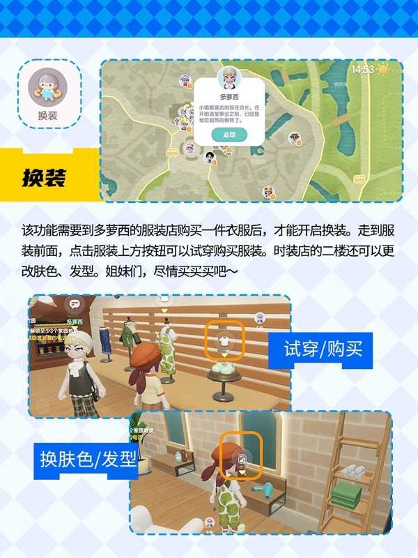 6.【换装】该功能需要到多萝西的服装店购买一件衣服后,才能开启换装。走到服装前面,服装上方按钮可以试穿购买服装。时装店的二楼还可以更改肤色、发型。姐妹们,尽情买买买吧~
