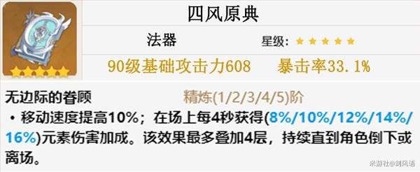 四风原典:为五星首选,增加暴击率和元素伤害。同时还提高移动速度。