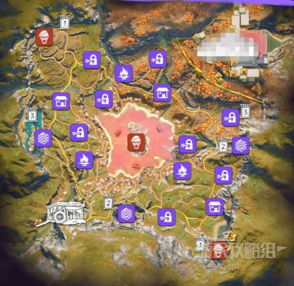 如下图,地图上的标记点位置是固定的:开锁标记代表军火库挑战,用来解锁各种武器;火焰标记代表试炼;房子标记代表安全屋;波浪标记代表支线(幻象);红色标记代表主线;白色数字代表传送点。