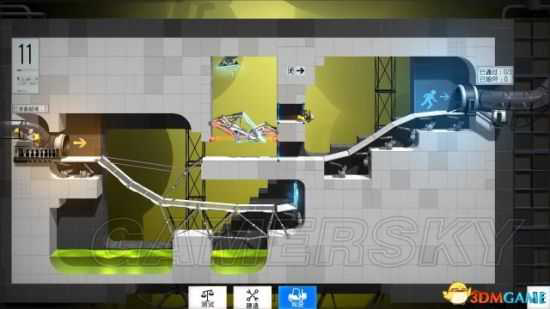 那么现在就要在激光射线上方搭上一条坚固的桥梁,一方面是让卡车跌落时作缓冲,另一方面是让卡车撞向中部的机枪炮,然后卡车就可以前往出口。