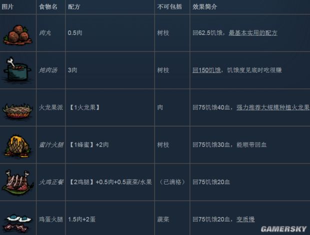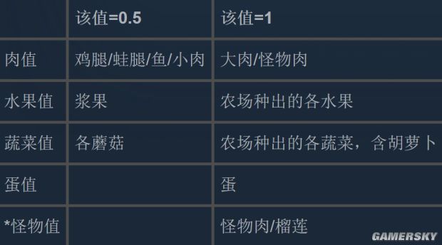 在学习配方前要引入“值”这个概念:饥荒的食物中,肉有“肉值”,蔬菜有“蔬菜值”,水果有“水果值”,还有“蛋值”,以将料理原料量化,形成配方。