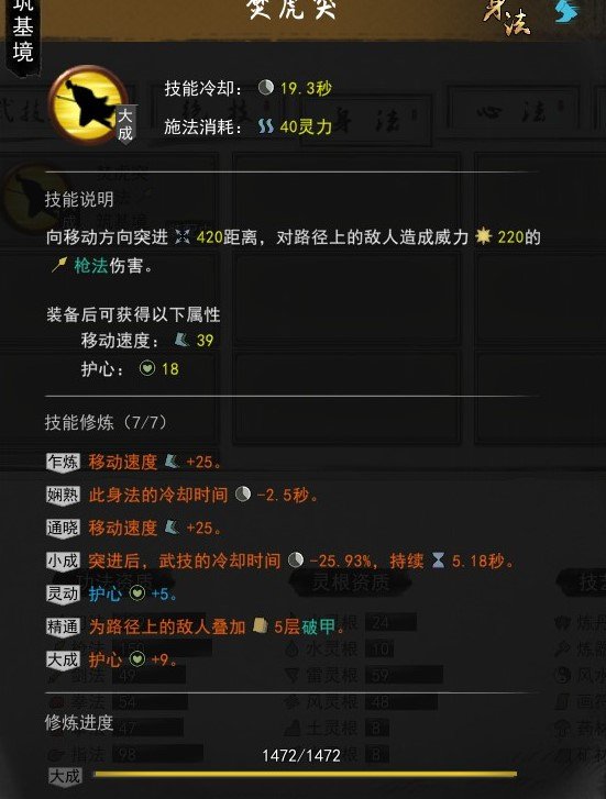 然后身法就枪本身筑基的有减cd就行,没必要用好的,元婴前减cd数值一样包括心法。枪神通用鬼狱也是自带减cd。这样下来就差不多有100%减cd了,如果有逆天改命武法,都不用洗完美也不用全红,橙红搭配就够。如果逆天没武法就用刀的会心心法也有减cd。我这里有武法就用枪本身的筑基+3充能的。