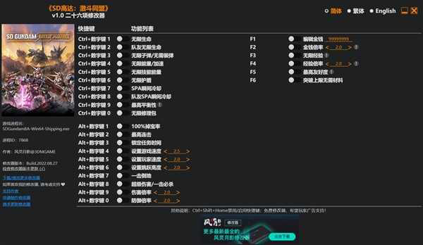 简体、繁体、English,可以切换语言 (切换语言后修改器将把该语言设置为默认语言)