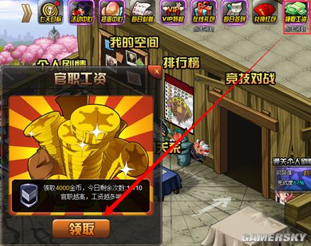 左上角的“领取工资”按钮,会弹出领取界面。每天可领取10次工资,很多钱哦。