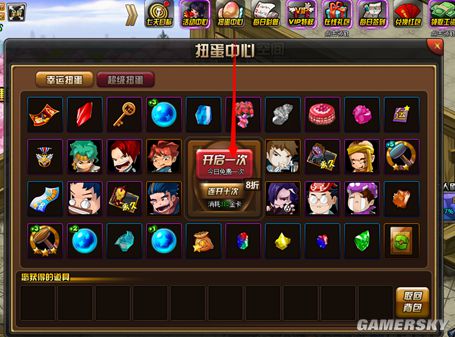 屏幕上方“扭蛋中心”按钮,可弹出扭蛋界面。每天有一次免费的机会,在扭蛋宝库进行抽奖哦,不要错过。