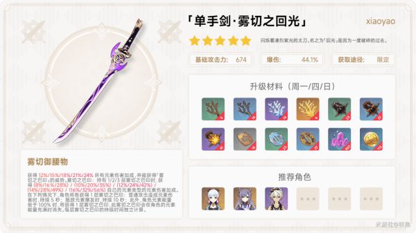 首先肯定是我们的专武雾切,加了爆伤可以说直接起飞,当然很多角色也都可以使用属于是单手剑天花板级别了