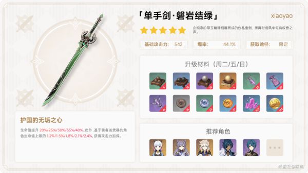其次是我们的五星单手剑磐岩结绿,也是一把泛用性很高的武器,但是绿剑是一把加暴击率的武器,这种情况凌华可以不建议使用冰套了暴击率会溢出,详细可看下面圣遗物攻略
