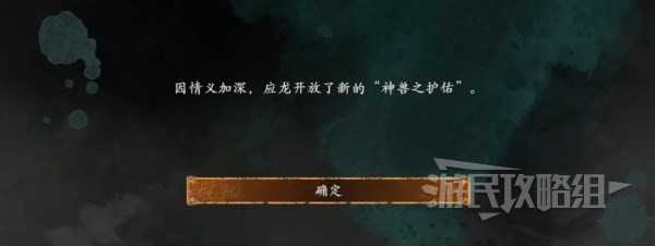 看完演职员名单后即可解锁第十只神兽「应龙」,同时可以习得应龙的「神兽之护佑」(无伤时伤害+5.6%~11.2%、化解的气势获得量+4.0%、装备物品掉落率A、秘技化解成功是减少受到的伤害)。