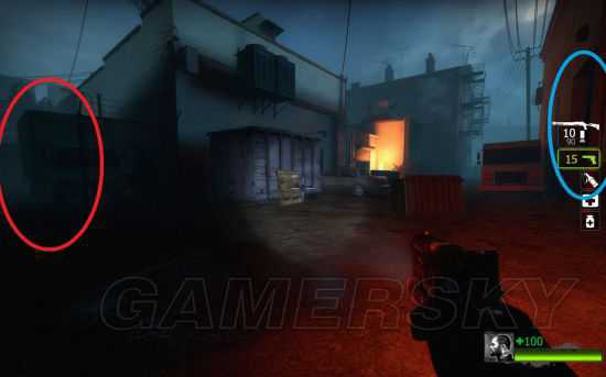 到达这个中转区域,画面左边的屋门口尸体旁有高级武器补给,右边蓝圈卡车上固定有两瓶药。