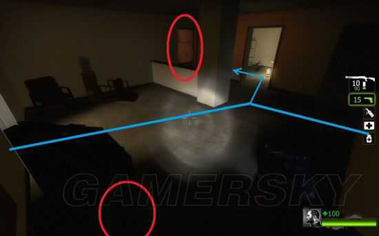 上平台进仓库,叉车后面有一个房间。注意仓库的天花板,两个天窗是可以被特感打破空降的。