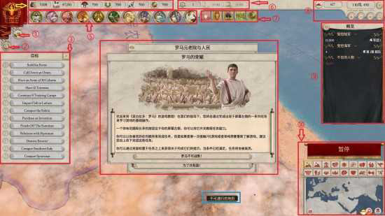 ⑨概览:这里是最近你你的操作以及各区域发生的事件,方便你掌握局势。概览还能进行例如增减募兵等操作。