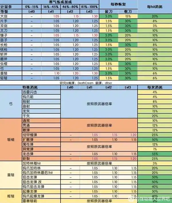 这个题材算刀很复杂,会心只算物理伤害1.25倍,实际上算上属会应该还要高。基于上文的表格,为了方便,寒气只分两部分算,高于50%算1.25倍伤害,低于50%算1倍伤害。斩味方面,白斩和紫斩虽然有一定差别,但是由于怪硬直高,大硬直可以不用考虑,小硬直算这个不如看看一共几刀会心。
