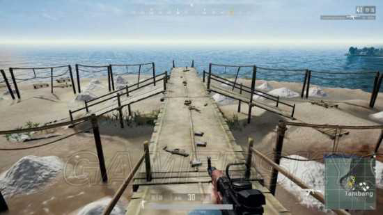 小木桥上有很多物资,晒盐处地势比较低,容易被上面房区的人卡,Luis这里提醒一下,跳晒盐处后,赶紧捡枪,绕到高处的房子后方会比较有优势。