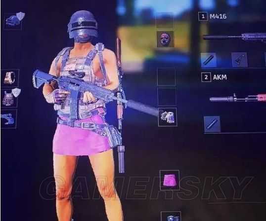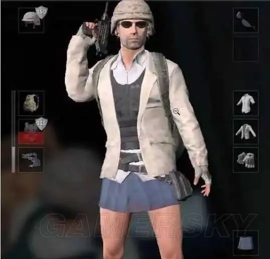 衬衫,短裙再加上一幅粗狂的面容。据说这是男性“吃鸡”玩家们最喜欢的混搭造型,大概是为了让敌人的视线离开你身体,因为太辣眼睛了?
