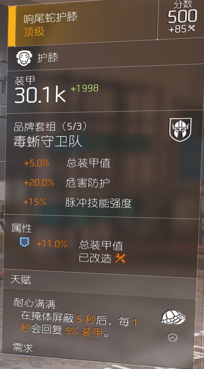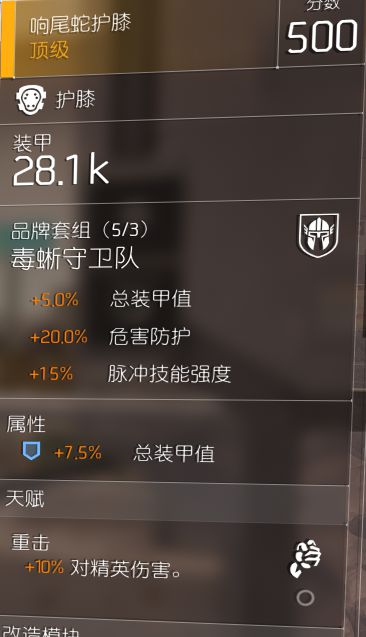 假如允许的话其实可以把枪套换成填满来弥补换弹速度,虽然现在填满需要消耗备弹而显得弱势了一些,但是毒蜥的枪套似乎固定无天赋,但毕竟有两个火力槽,实际上增伤比较明显,不记得有没有彼得罗夫枪套了,如果是有的话,带一蓝的彼得罗夫枪套比较好,毕竟10%机枪伤。至于膝盖,如果需要蹲掩体的话,膝盖其实可以换成龟壳,追求dps还是用重击吧,虽然重击被砍了一刀。