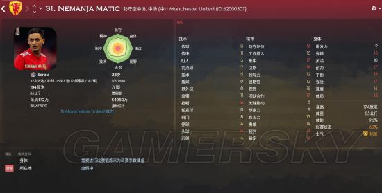 曼联中场马蒂奇,CA157,在塞尔维亚队中并列第一,他是一名有一定组织能力的防守型后腰,身材高大,传球15,视野15保证了出球能力,16的防守站位和抢断在后腰位置上也算出色,194的身高加上16的弹跳、头球,让他在定位球、角球中也极具威胁,他的精神属性很不错,身体素质也非常强悍,平衡高大19,强壮、耐力17,但相对移动能力很差,爆发力9,灵活10,速度14。