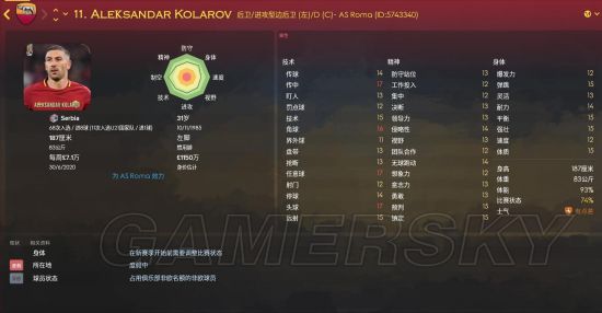 32岁的科拉罗夫依然保持的非常不错的状态,虽然速度不快,但科拉罗夫的优势在于他强大的进攻能力,传中17,远射15,角球16,任意球17,很难想象这是一名边后卫,防守方面科拉罗夫只能算中规中矩,防守站位、盯人、抢断都是13,精神身体属性也比较平庸。