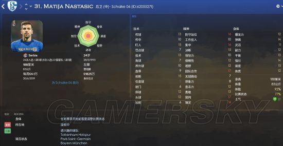 他身材高大,191的身高,17的弹跳,18的头球,17的无球跑动,这样的数据简直就是轰炸机,虽然身材高大,但脚下技术却一点也不粗糙,传球15,技术15,盘带14,停球15,射门14,想象力更是高达17,非常全面的数据。精神属性里最出色的是17的勇敢和16的意志力。
