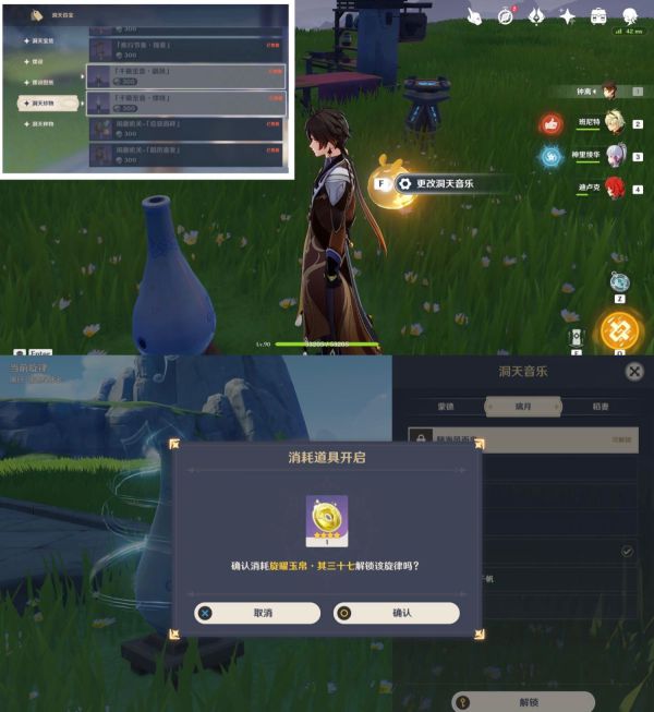 ②买完后将摆件安装在尘歌壶中,靠近即可“更改洞天音乐”,可解锁的唱片即可切换歌曲了。