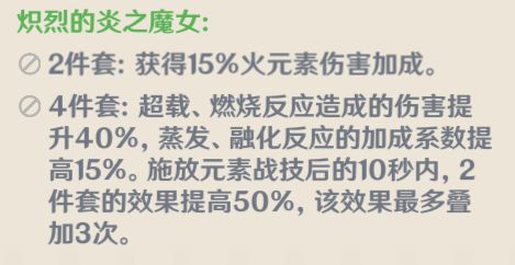 而且,由于可莉的元素战技初始可以释放两次,因此可以进一步在一定时间内提升火元素伤害,这就使得在魔女4件在搭配可莉时拥有了可观的爆发输出能力。