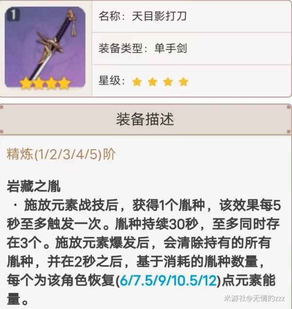 天目影打刀作为稻妻的白嫖武器,我们可以通过锻造来进行获取,且获取难度并不是很大,容易精炼,对于大多数玩家再说,其为神里绫华四星武器正解。其所带来的攻击力副词条可以使绫华的面板更加立体,且其被动所附带的元素充能,在利用得当时,可以大幅度提升实战的循环。