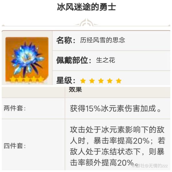 优点:其在2件套时,便可以为我们带来15%的冰元素伤害加成,4件套20%的暴击率再配合上配合上双冰共鸣的效果,基本解决暴击率问题。