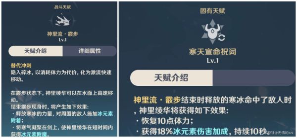 2.神里绫华的特殊天赋:神里流.霰步,绫华以消耗体力为代价遁入地面进行高速移动。当霰步结束后及释放的寒冰命中敌人时,绫华可以获得短暂的冰元素附魔及冰伤加成。