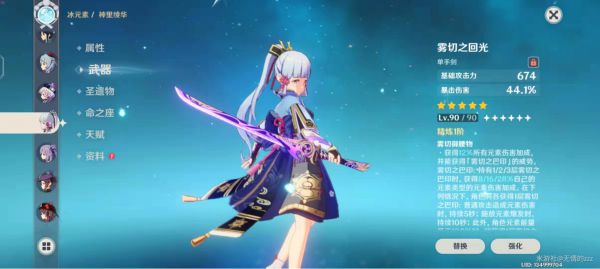 1.首选雾切,雾切作为绫华的专武,在强度和外观上均是我们的不二之选。其高额的攻击力以及爆伤的副词条都可为绫华的属性面板添上浓墨重彩的一笔,且绫华能轻而易举的吃满其带来的三层被动,能显著提高绫华的输出能力。