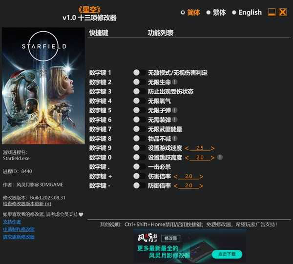 简体、繁体、English,可以切换语言 (切换语言后修改器将把该语言设置为默认语言)