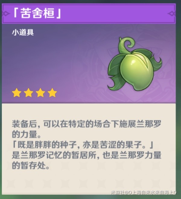 《原神》中苦舍桓可以在特定的场合下施展兰那罗的力量,许多玩家不知道苦舍桓怎么获取。想要的话请看下面由“O上海自来水来自海上O”分享的《原神》苦舍桓获取方法,一起来看看吧。