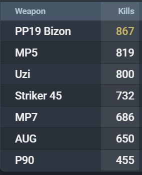 冲锋枪的爆头击杀会慢很多,硬核下一扫就死,再加上击杀快,整体击杀数高于500