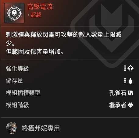 首要介绍重中之重的关键红色模块-高压电流(困难纵火者掉落),整个构筑的核心。